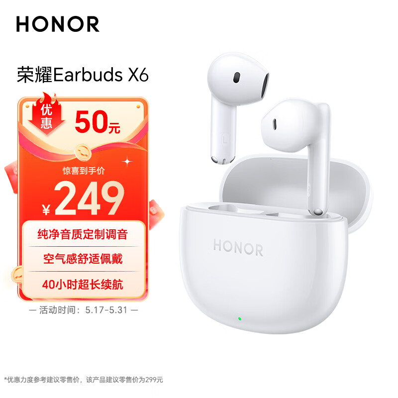 荣耀耳机 X6 蓝牙耳机 通话降噪 蓝牙5.3 40h续航 白色 通用(华为手机苹果耳机 SE2 4E Pro3 耳夹)价格:159.00元!