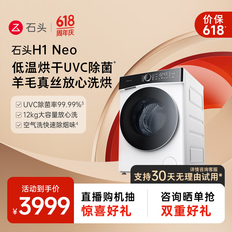 石头分子筛洗烘一体机H1 Neo 家用12kg公斤大容量滚筒洗衣机洗烘一体洗衣机全自动智能投放空气洗 冰川白 洗烘一体机价格:3999.00元!