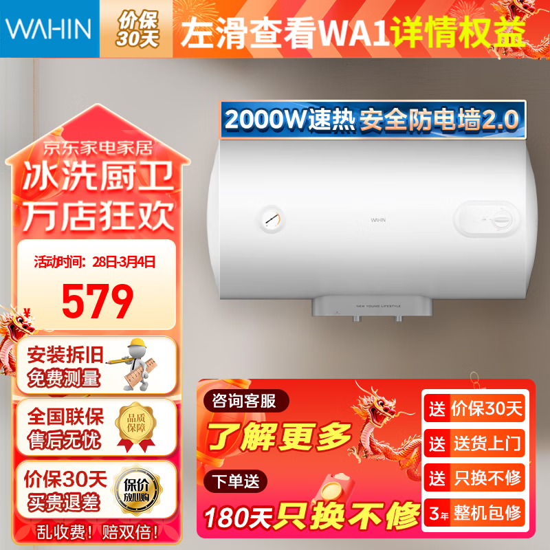 美的(Midea)出品【23年新款】电热水器家用多升数可选洗澡节能省电储水式热水器省电小体积电热水器速热 2000w-60升美的华凌WA1系列价格:779.00元!