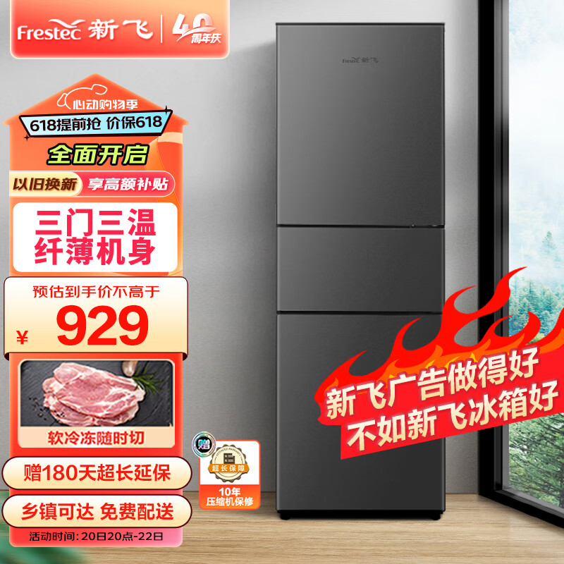 新飞(Frestec)209升三门三温区双层抽屉直冷家用租房低音节能小巧不占地软冷冻电冰箱 BCD-209KT价格:929.00元!