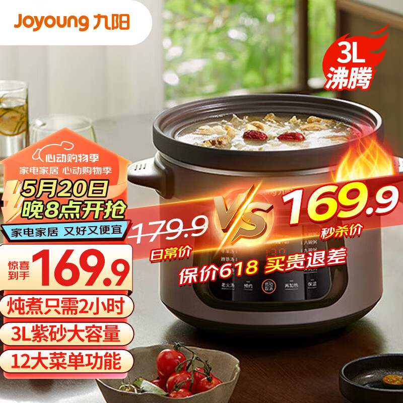 九阳(Joyoung)电炖锅 电砂锅 电炖盅 炖汤盅煲汤锅 紫砂锅 燕窝炖盅 煮粥神器 熬粥专用锅 3L大容量GD305价格:169.90元!