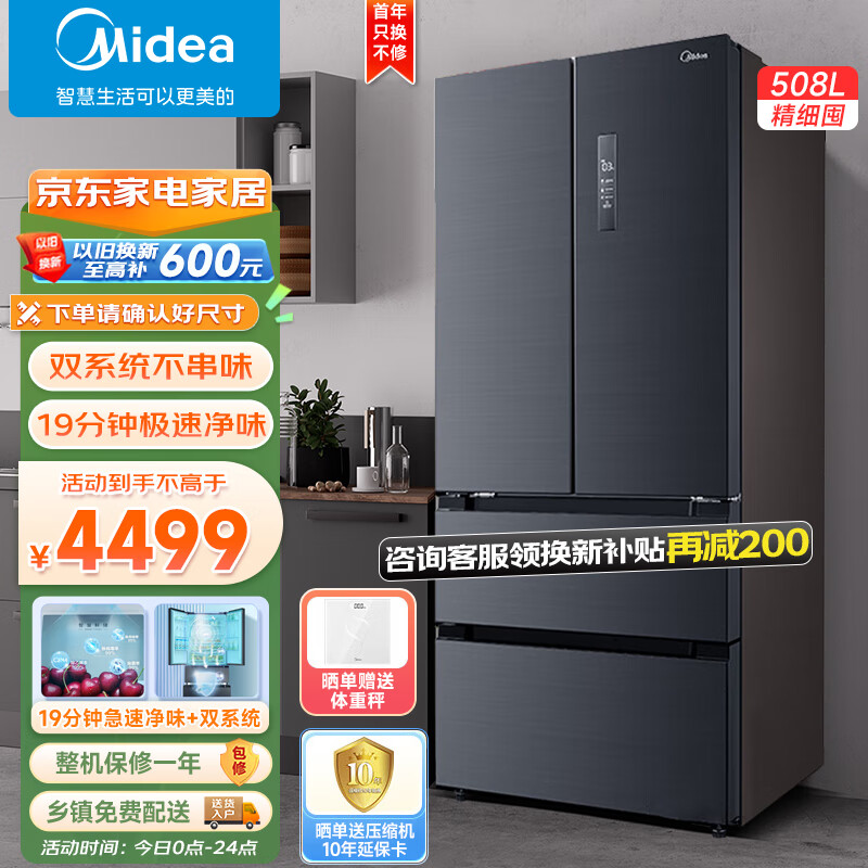 美的(Midea)508升法式多门四开门冰箱大容量家用变频一级能效双系统双循环电冰箱BCD-508WTPZM(E)莫兰迪灰价格:4999.00元!