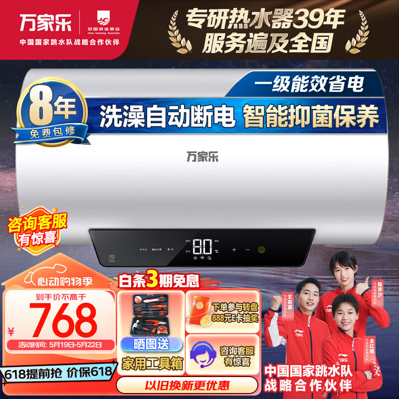 万家乐电热水器60升 储水式一级能效2500W速热 出水自动断电 智能保养手机智控D60-FW2价格:768.00元!