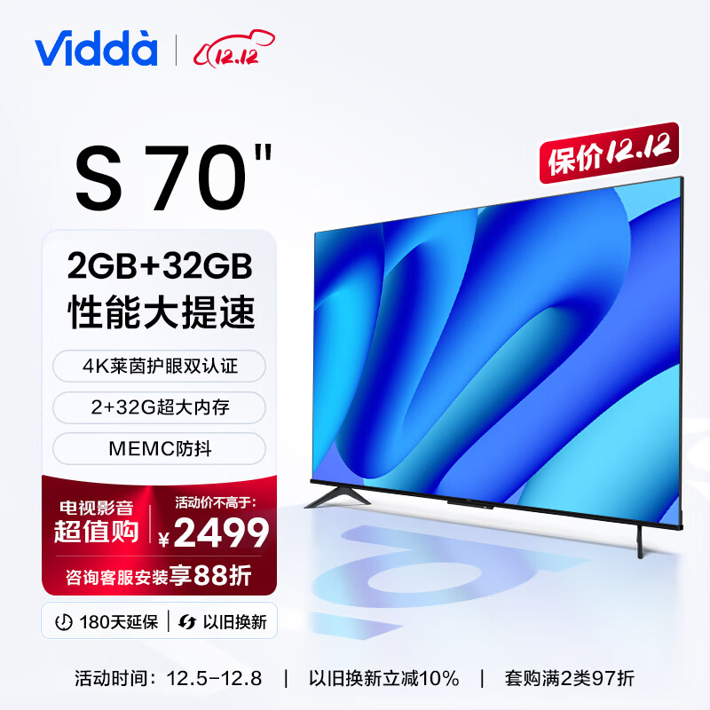 Vidda S70 海信 70英寸 超薄屏 2+32G 远场语音 MEMC防抖 智慧屏 智能液晶巨幕电视以旧换新70V1F-S价格:3499.00元!