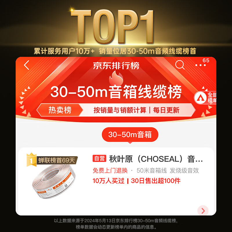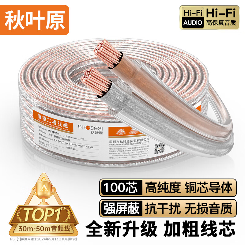 秋叶原(CHOSEAL)音频线 音响线 音箱线 喇叭线 发烧级 增强型屏蔽抗干扰 纯铜100芯 50米 QS2241T50S价格:175.00元!