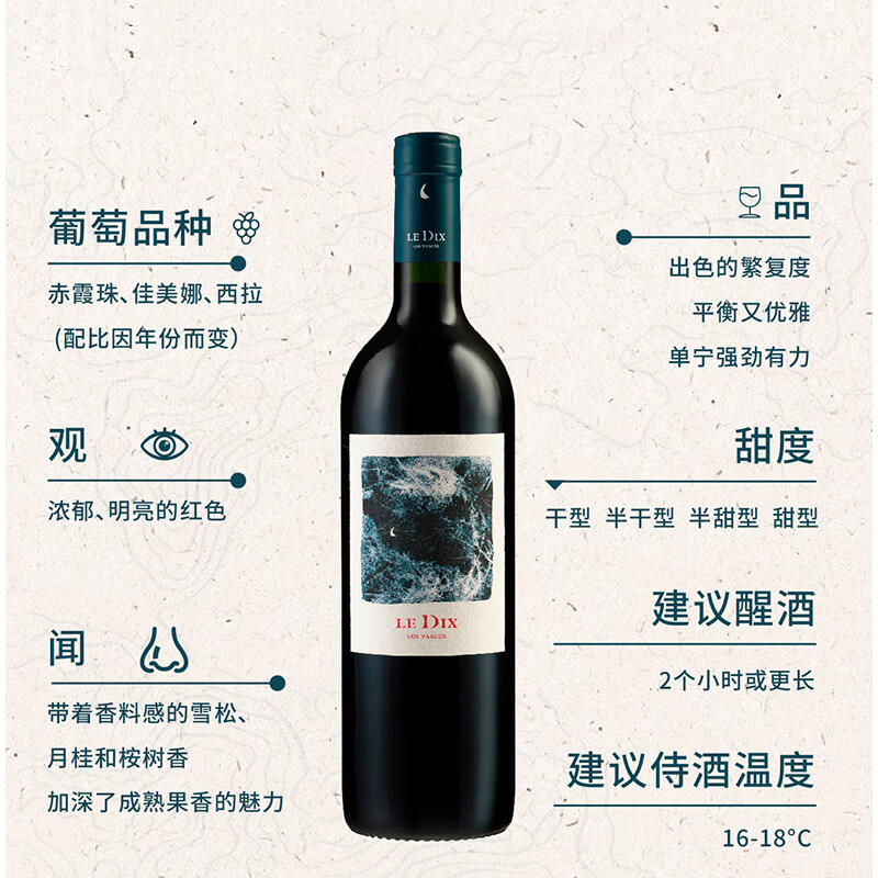 葡萄品种:赤霞珠(CabernetSauvignon),西拉/设拉子(Syrah/Shiraz),佳美娜(Carmenere)