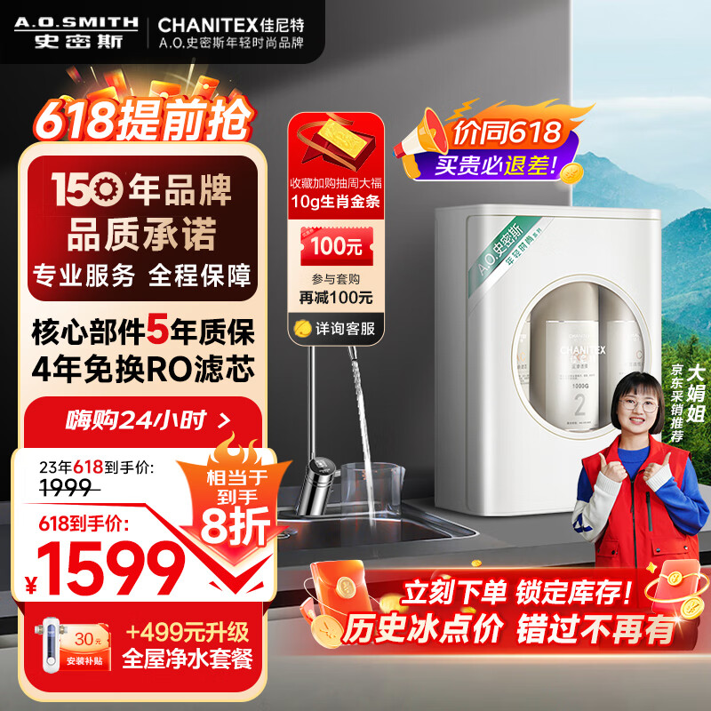 史密斯(A.O.SMITH)佳尼特净水器家用厨下式直饮净水机专利4年RO膜反渗透滤芯1.6升/分钟大眼萌CXR600-A1 以旧换新价格:1599.00元!
