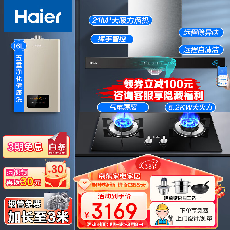 海尔(Haier)抽油烟机21立方一级能效欧式顶吸ET918+5.2KW灶Q2BE50+16升热水器16K3BD厨房三件套[家电]价格:3269.00元!