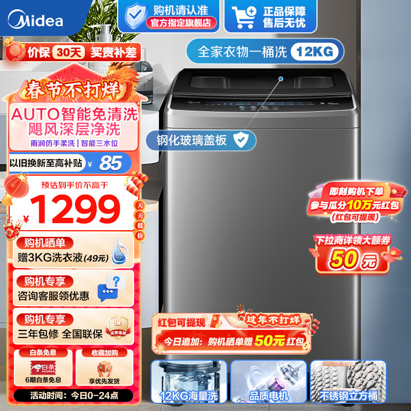 美的(Midea)洗衣机全自动波轮 12公斤kg升级大容量海量洗 以旧换新专利免清洗 十年桶如新 深层劲洗 MB120V733E价格:1299.00元!