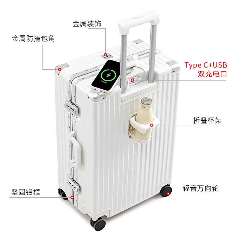 DULA铝框行李箱高颜拉杆箱杯架USB充电旅行密码箱皮箱子皓月白24英寸价格:399.00元!