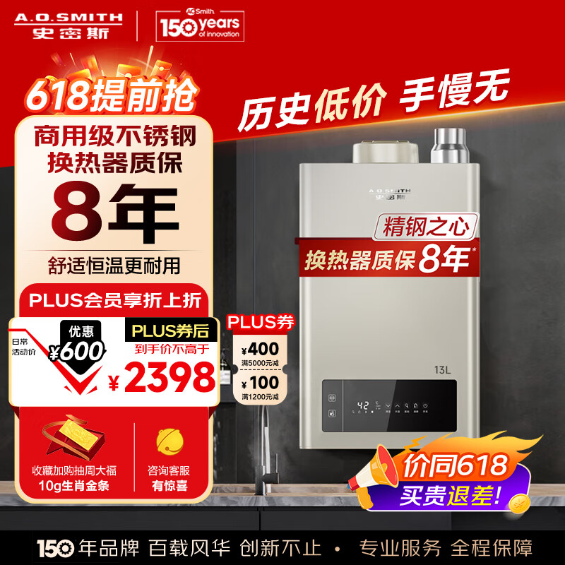 史密斯(A.O.SMITH)13升燃气热水器 不锈钢换热器包8年 负压燃烧更 精控恒温 抗风防冻 家用天然气 JSQ26-TM5价格:2698.00元!