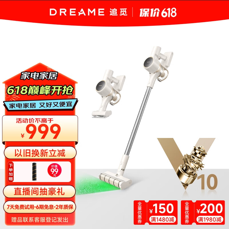 追觅吸尘器V10S 无线手持家用 绿光显尘 贴边软绒滚刷 155AW大吸力长续航 高速马达 家庭宠物适用价格:999.00元!
