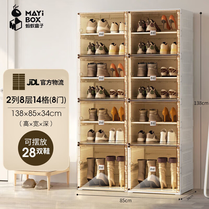 蚂蚁盒子(MAYIHEZI)免安装简易鞋柜门口玄关折叠鞋盒子茶色塑料超薄鞋柜 2列8层14格价格:519.00元!