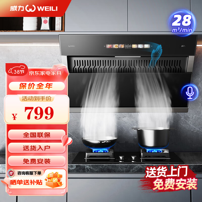 威力(WEILI)抽油烟机侧吸式家用吸油烟机28m3/min大吸力厨房油烟机脱排油烟机挥手智控自清洗WLCX05价格:799.00元!