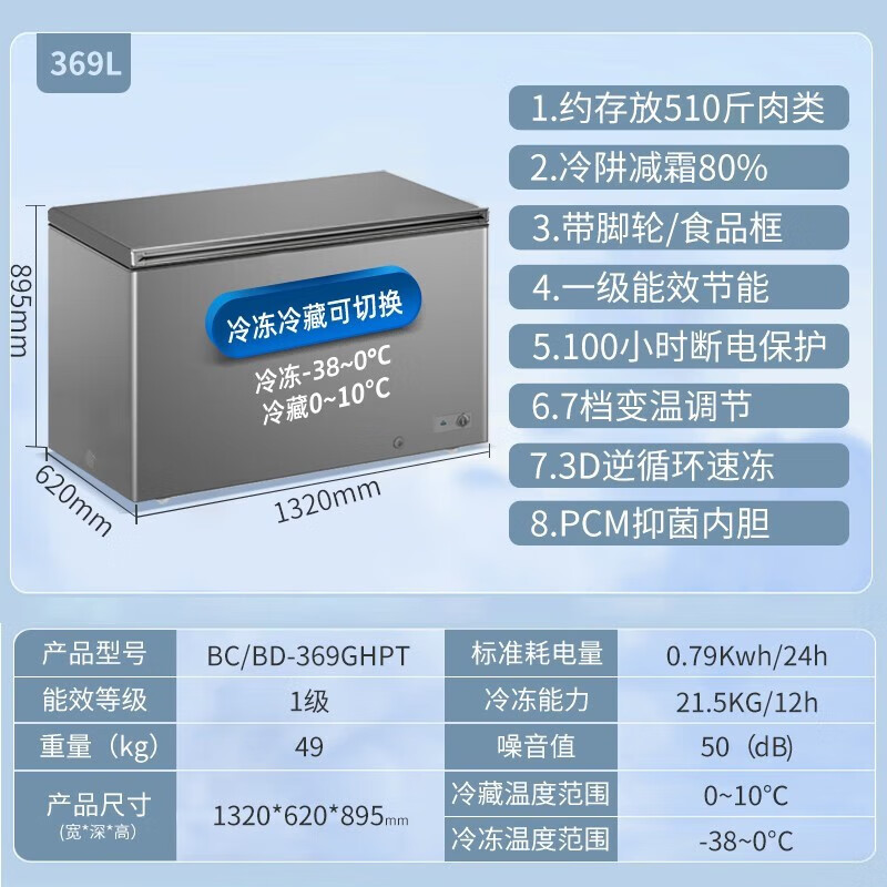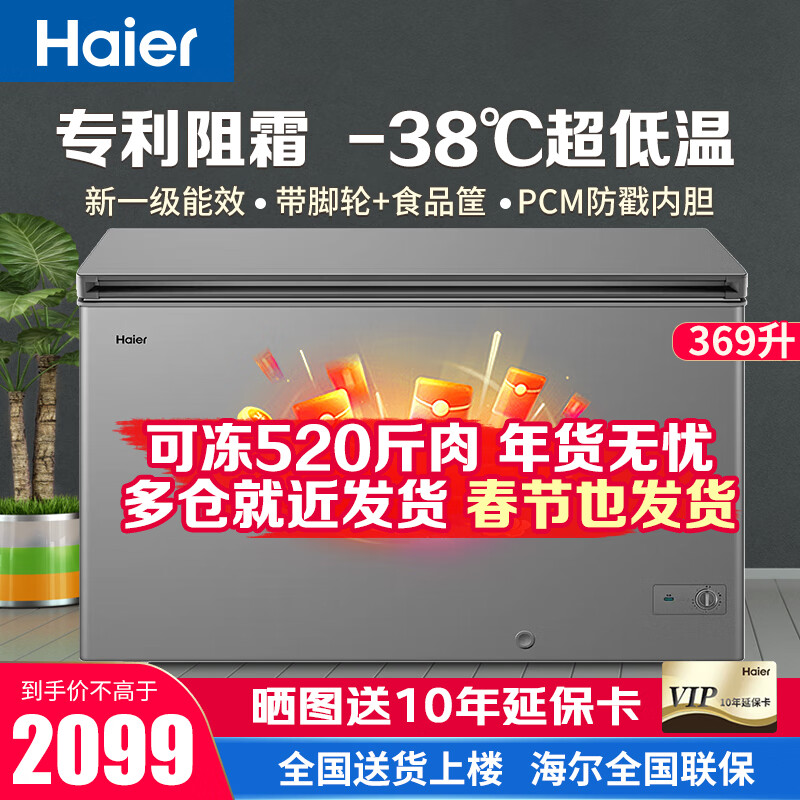 海尔冰柜369升-38度超低温大容量全冷冻家用商用冷藏冷冻两用一键转换阻霜速冻冷柜海鲜保鲜柜价格:2098.00元!
