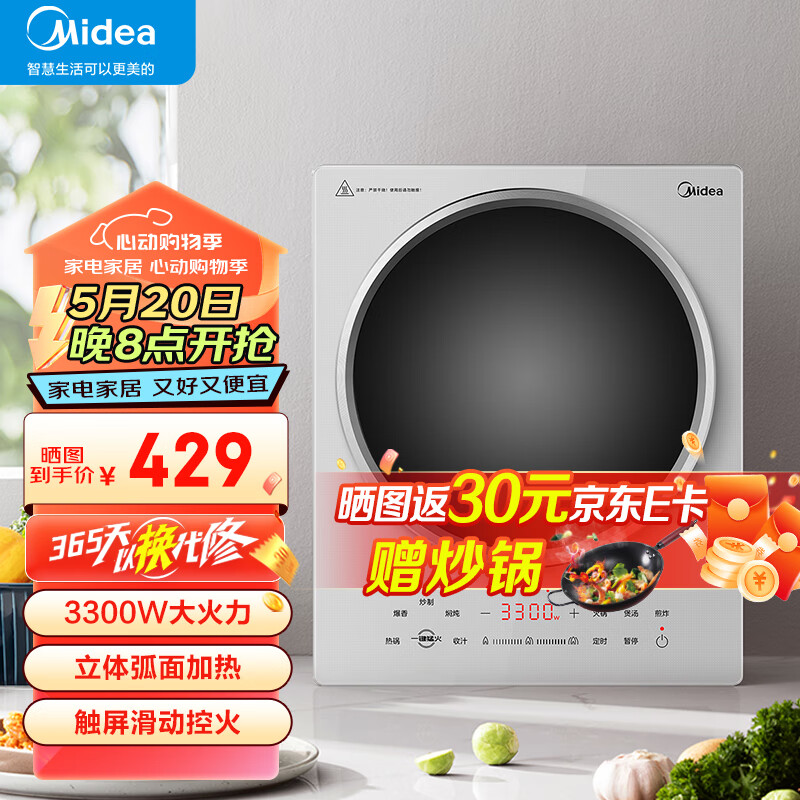 美的(Midea)电磁炉 家用凹面电磁灶 3300W大功率速热触控微晶面板防水保护定时炒锅一体 MC-E33CA11【银色裸机款】 3300W大功率价格:699.00元!