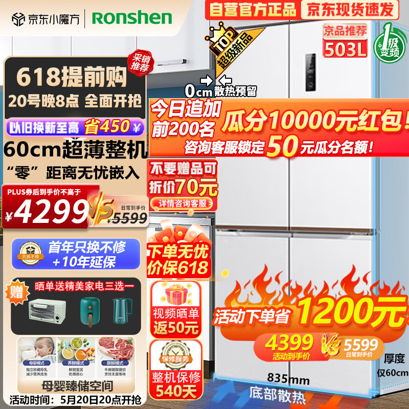 容声(Ronshen)60厘米薄零嵌入式503升十字对开四开门冰箱家用一级能效变频底部散热超薄大容量BCD-503WD1FPQ价格:5599.00元!