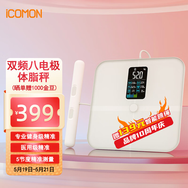 沃莱(ICOMON)体脂秤高精准八电极智能体重秤可充电健身房专用电子秤自有APP人体健康数据监测体脂仪价格:399.00元!