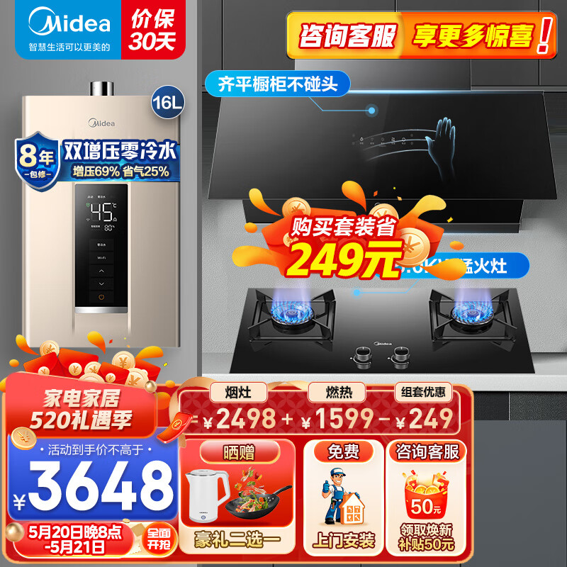 美的(Midea)侧吸抽油烟机灶具烟灶多件套装燃气热水器家用烟灶燃热厨房三件套J37+Q330+16NT1S天然气价格:3648.00元!