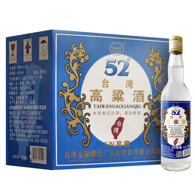 五缘湾浓香型白酒 台湾高粱酒 五N窖藏 52度 600ml*12瓶 整箱 自饮口粮价格:188.00元!