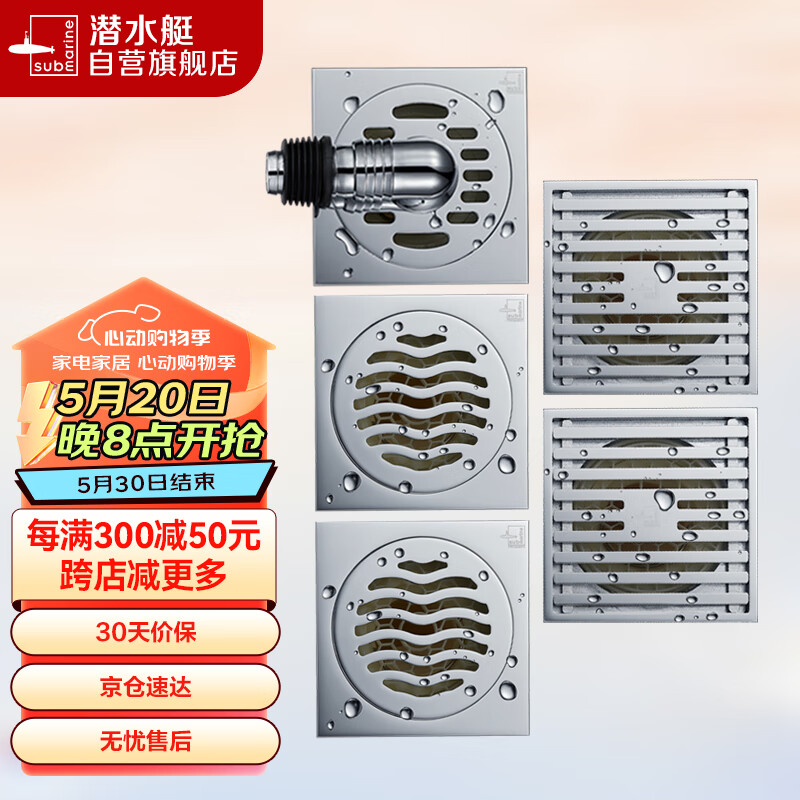 潜水艇(Submarine)铜镀铬防臭地漏套装50管径2个淋浴+2个干湿区+洗衣机地漏价格:458.00元!
