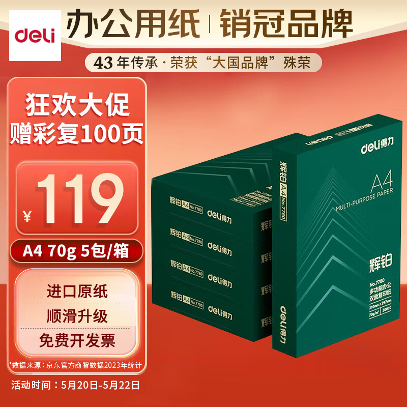 得力(deli)辉铂A4打印纸 70g500张*5包一箱 进口原纸复印纸 双面顺滑打印 整箱2500张 7783【品质升级】价格:119.00元!