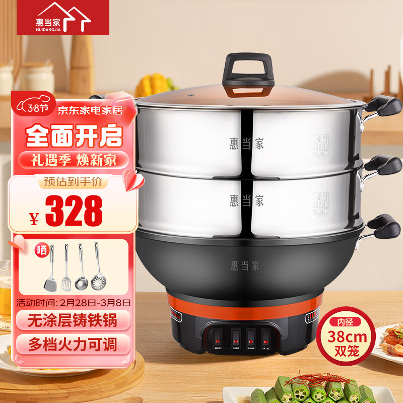 惠当家(Hui Dang Jia)电炒锅多功能电热锅电锅加厚电蒸锅电煮锅一体铸铁锅电火锅多用途锅 铸铁锅身-38cm双笼 6.5L价格:338.00元!