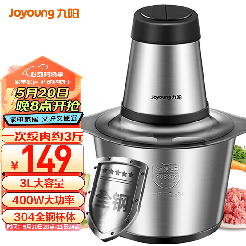 九阳(Joyoung)绞肉机家用电动多功能料理机搅拌婴儿辅食机切菜绞馅不锈钢碎肉S30-LA569价格:149.00元!