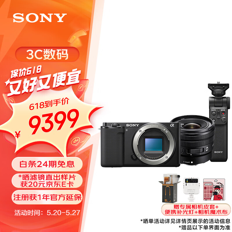 索尼(SONY)ZV-E10+SELP1020G 广角镜头+多功能手柄 半画幅微单相机 美肤拍照 颜值机身 精准对焦 黑色价格:9399.00元!