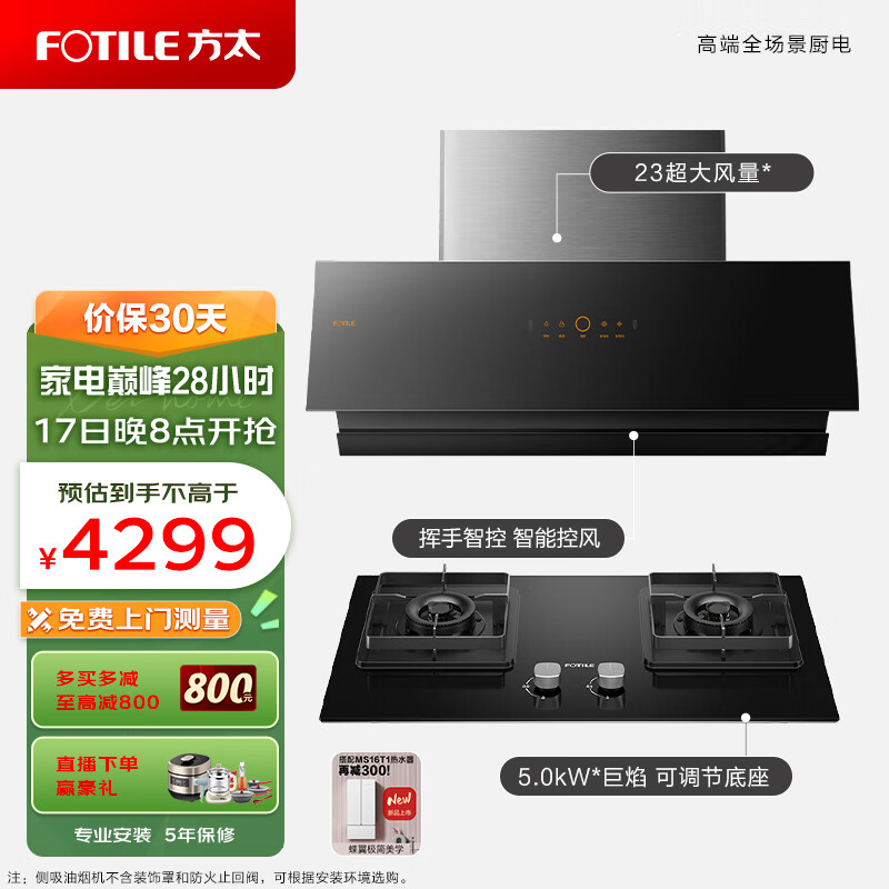方太(FOTILE)抽吸油烟机灶具套装侧吸式变频烟灶23大风量智能巡航挥手5.0kW燃气灶01-JCD10TA+TH36B厂送/液化气价格:4299.00元!