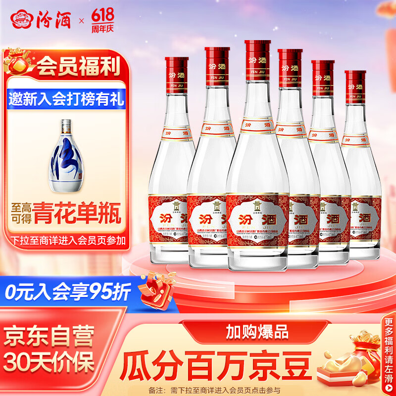 汾酒 红盖玻汾 清香型白酒 42度 475ml*6瓶 整箱装 非原箱发货价格:289.00元!