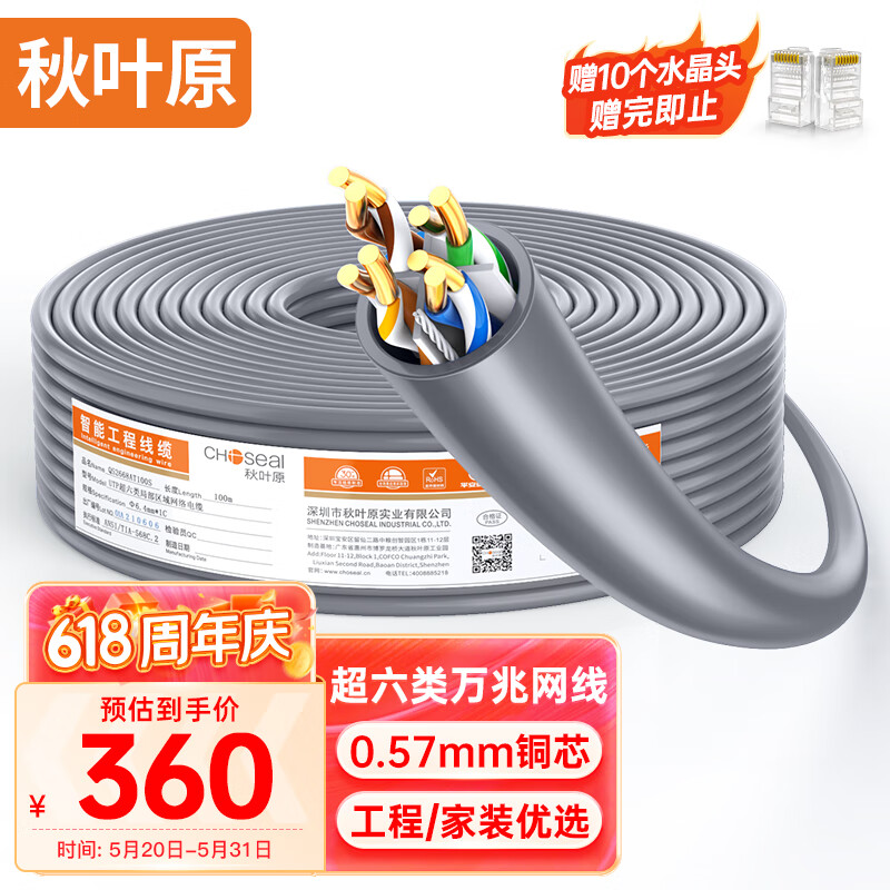 秋叶原(CHOSEAL)原装超六类非屏蔽网线 CAT6A类万兆高速 纯铜线芯 工程家装网络箱线 灰色100米 QS2668AT100S价格:379.00元!