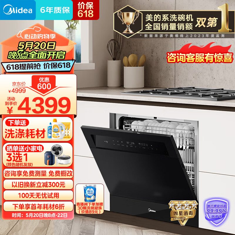 美的(Midea)洗碗机嵌入式台式家用灶下13套105℃热风烘干一级水效一键单消毒四星消毒变频节能V9价格:6999.00元!