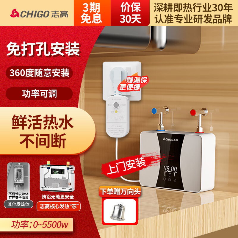 志高(CHIGO)即热式小厨宝5500W 即热式电热水器 不限水量厨房热水器 电热水龙头加热器 过水热包安装ZG-KB519价格:308.00元!