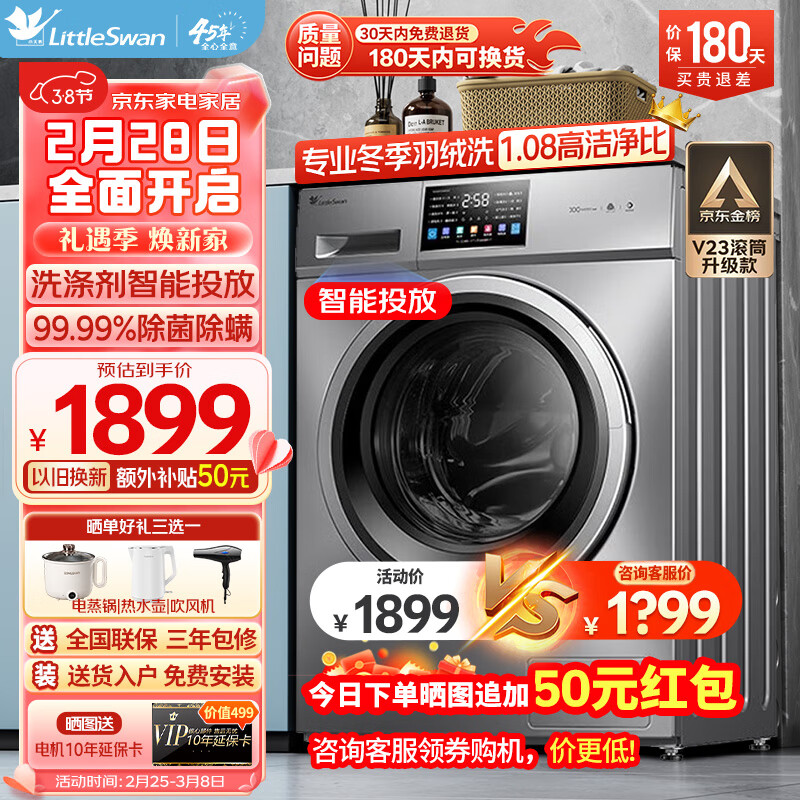 小天鹅滚筒洗衣机全自动 超薄全嵌 智能投放洗涤剂 除螨除菌羽绒服洗 10公斤大容量变频 TG100V23WIDY价格:1999.00元!