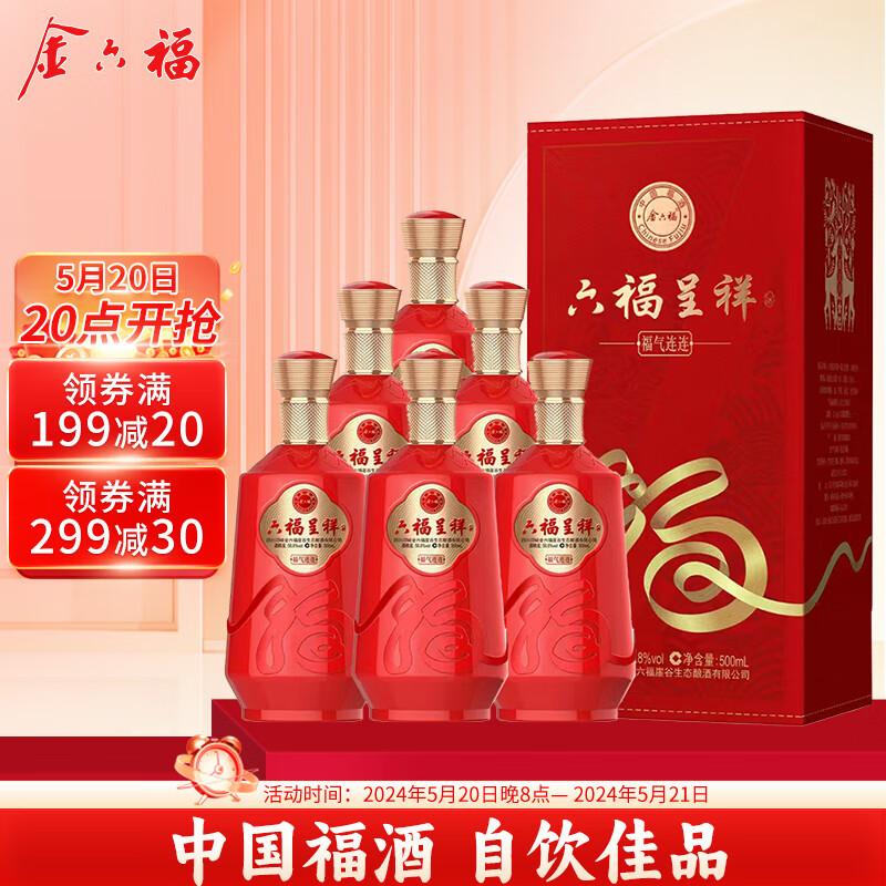 金六福 六福呈祥 福气连连 礼赠酒 50.8度 500ml*6瓶 整箱装 婚宴送礼价格:218.00元!