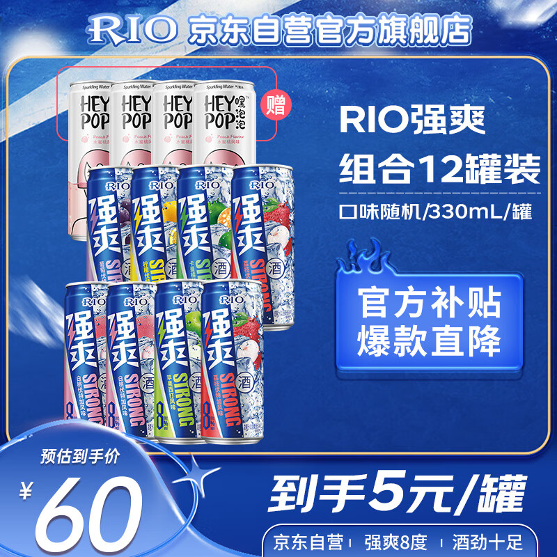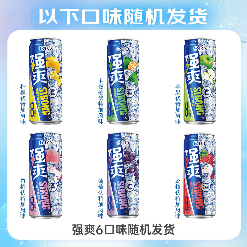 锐澳(RIO)预调 鸡尾酒 果酒 强爽8度 330ml*8罐+赠气泡水*4罐(6种口味)价格:60.00元!