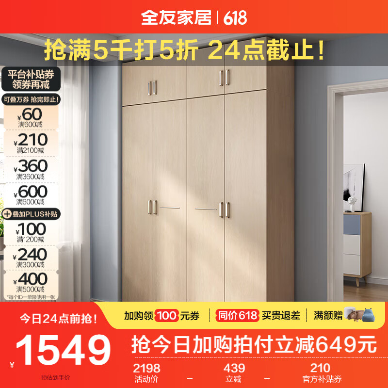 全友家居 衣柜自然原木风木纹衣柜多规格组合卧室储物柜子106302价格:2198.75元!