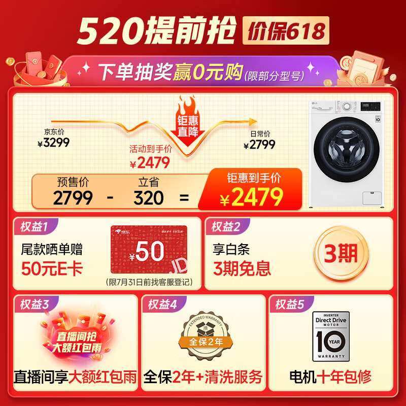 LG纤慧系列升级款 10KG超薄全自动滚筒洗衣机家用 蒸汽除菌 565mm超薄机身 14分钟快洗 白色FCY10Y4W价格:2799.00元!