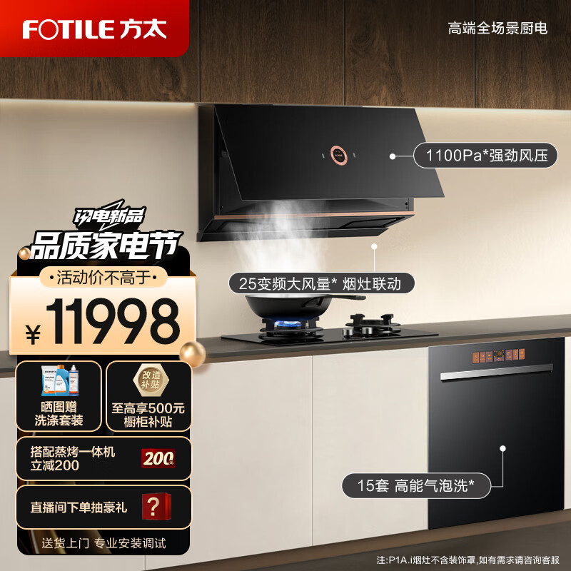 方太(FOTILE)烟灶洗三件套 25大风量超薄近吸烟机 5.0kW烟灶联动燃气灶 15套嵌入式洗碗机 P1A.i+THF1A+VF1.i价格:11998.00元!