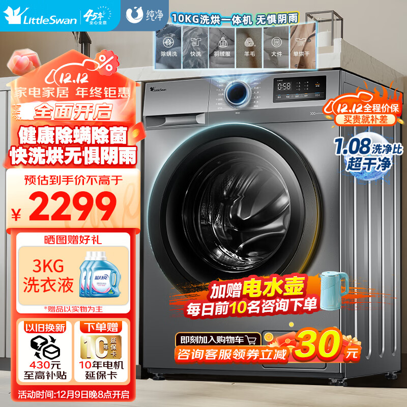 小天鹅(LittleSwan)滚筒洗衣机全自动 10公斤大容量洗烘一体 1.08高洗净比 除菌净螨 TD100YQ2【096升级款】价格:2269.00元!