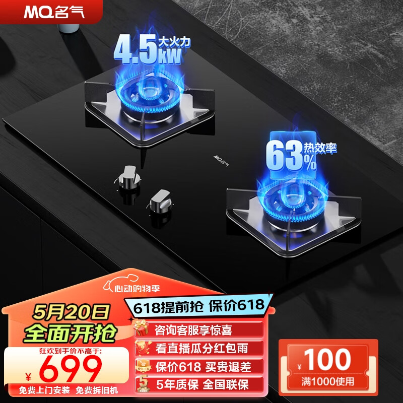 名气(MQ)老板燃气灶家用煤气灶双灶全进风大火力台嵌两用4.5KW瞬时点火大火力灶具液化气B305A价格:699.00元!