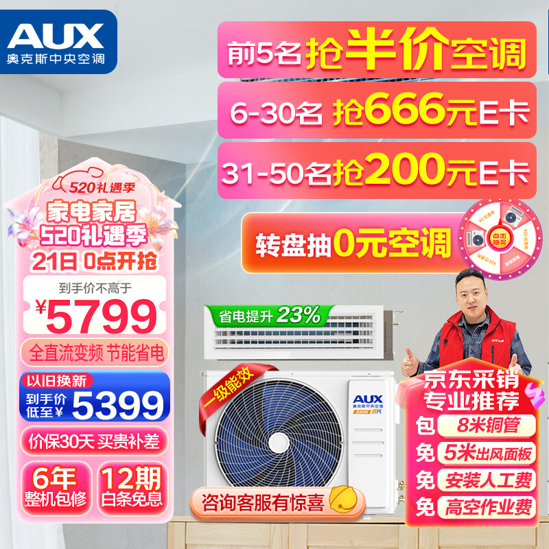奥克斯(AUX)中央空调风管机一拖一3匹一级能效全直流变频客厅卧室嵌入式空调GRD72/BPR3QA-QF2(B1) 京仓派送价格:5799.00元!