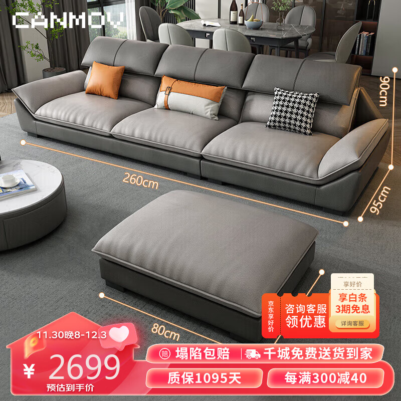 canmov 沙发 科技布沙发客厅轻奢北欧风现代大小户型 三人+脚踏 SF2022价格:3099.00元!