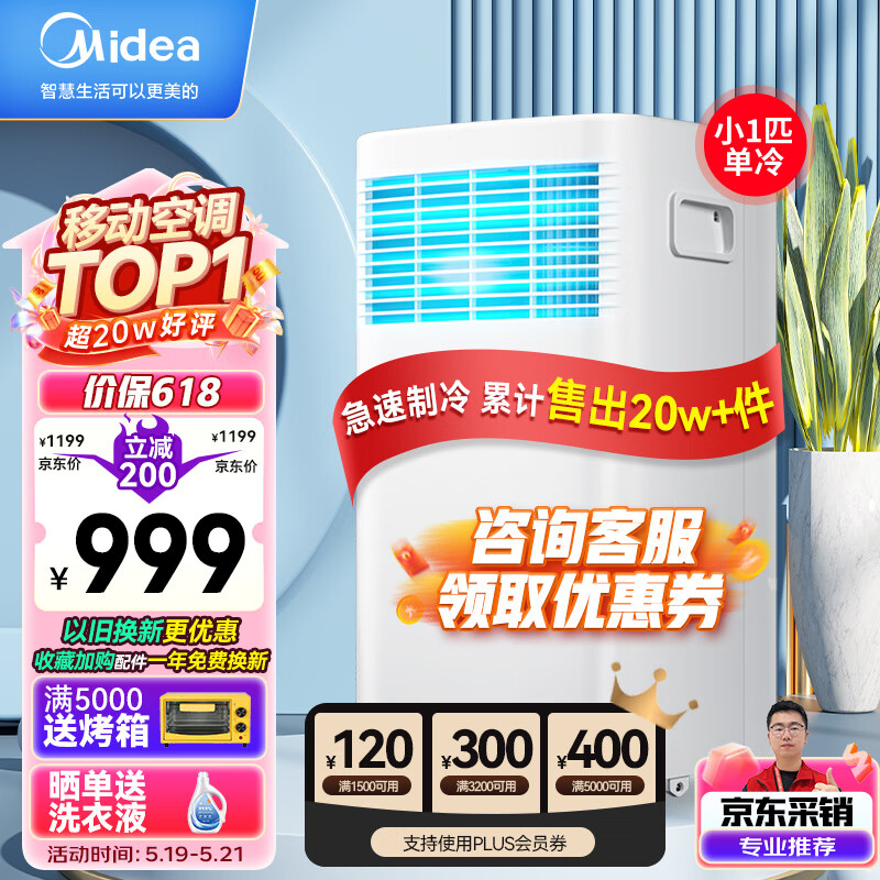 美的(Midea)移动空调小1匹单冷 家用出租屋一体机无外机免安装便捷立式空调 KY-15/N7Y-PHA价格:999.00元!