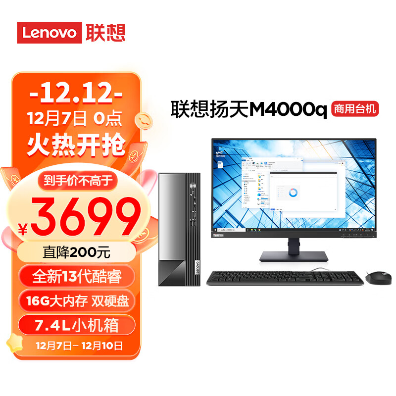 联想(Lenovo)扬天M4000q 英特尔酷睿i3 商用台式机电脑主机(13代i3-13100 16G 1T+512G wifi Win11)23英寸价格:3699.00元!