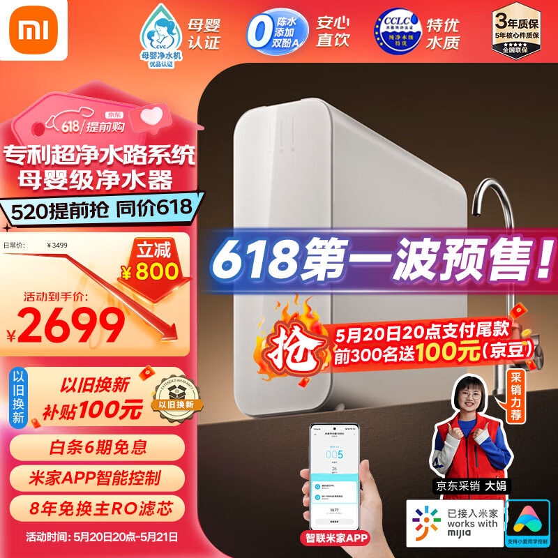 米家【24年旗舰款】小米1200G Pro 双核 家用净水器 无罐厨下式直饮机 8年RO滤芯 5:1纯废水比 3.2L/分价格:2699.00元!