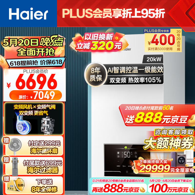 海尔(Haier)双变频一级能效冷凝燃气壁挂炉天然气采暖炉热水器板换式地暖暖气片五点恒温LL1PBD20-JN7(T)U1价格:7099.00元!