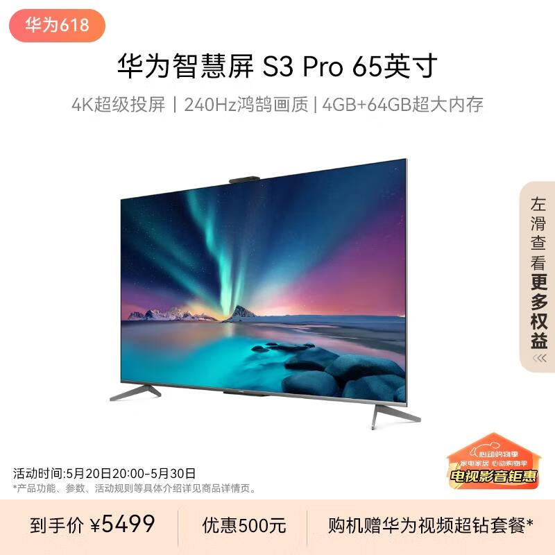 华为智慧屏 S3 Pro 65英寸 Pura 70投屏好搭档 超高清屏 智能液晶超薄护眼大内存电视机HD65AJMS价格:5399.00元!