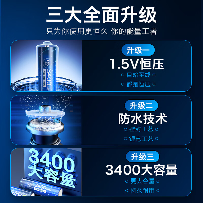 德力普(Delipow)充电电池 5号锂电池3400mWh大容量8节装1.5V恒压配4槽智能快充充电器适用玩具/游戏手柄/KTV话筒价格:197.80元!